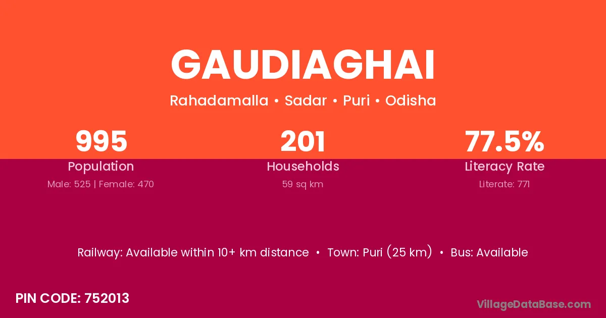 Puri (25 km) is the nearest town to Gaudiaghai village for major economic activities and is located approximately 25 km away.
