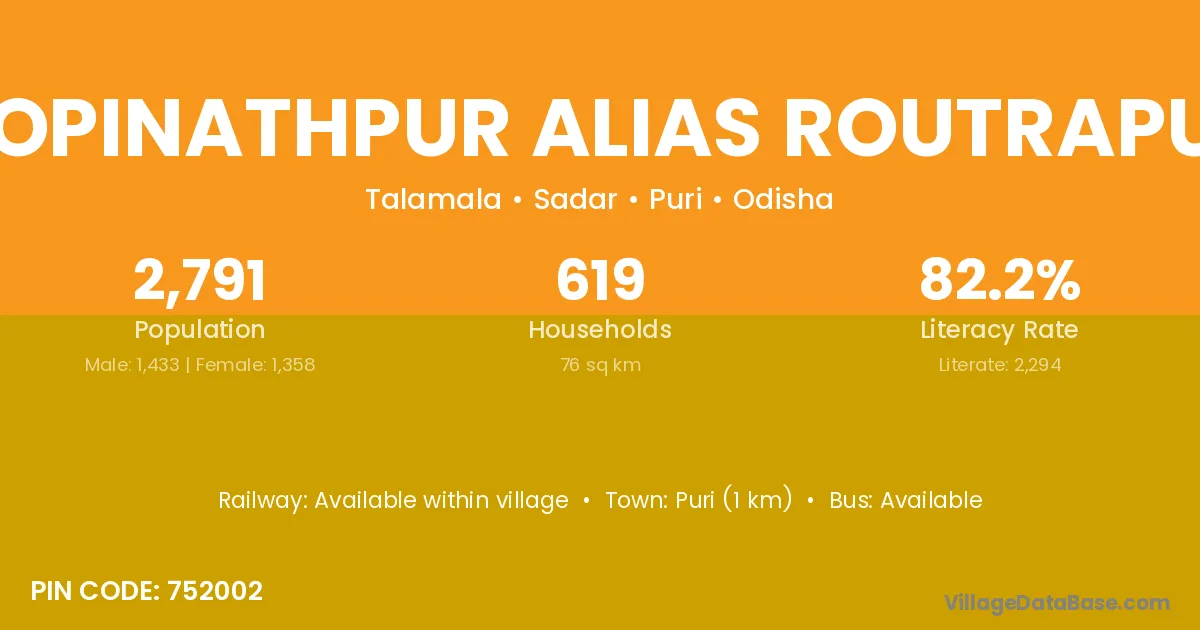 Puri (1 km) is the nearest town to Gopinathpur Alias Routrapur village for major economic activities and is located approximately 1 km away.