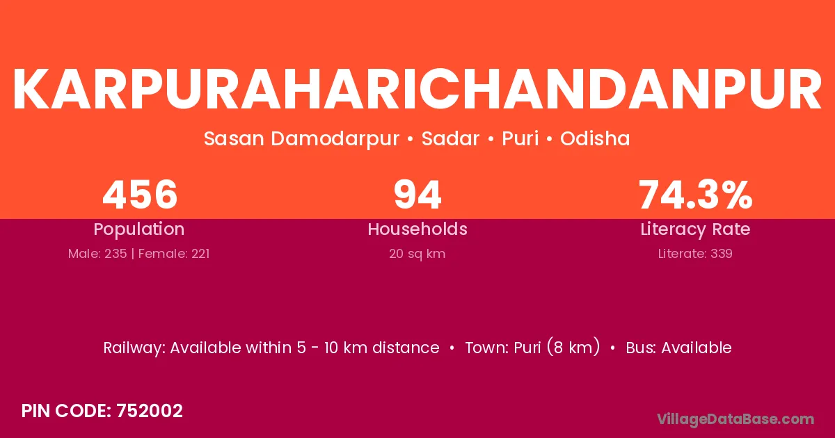 Karpuraharichandanpur village has a total population of 456 people, of which 235 are males and 221 are females.