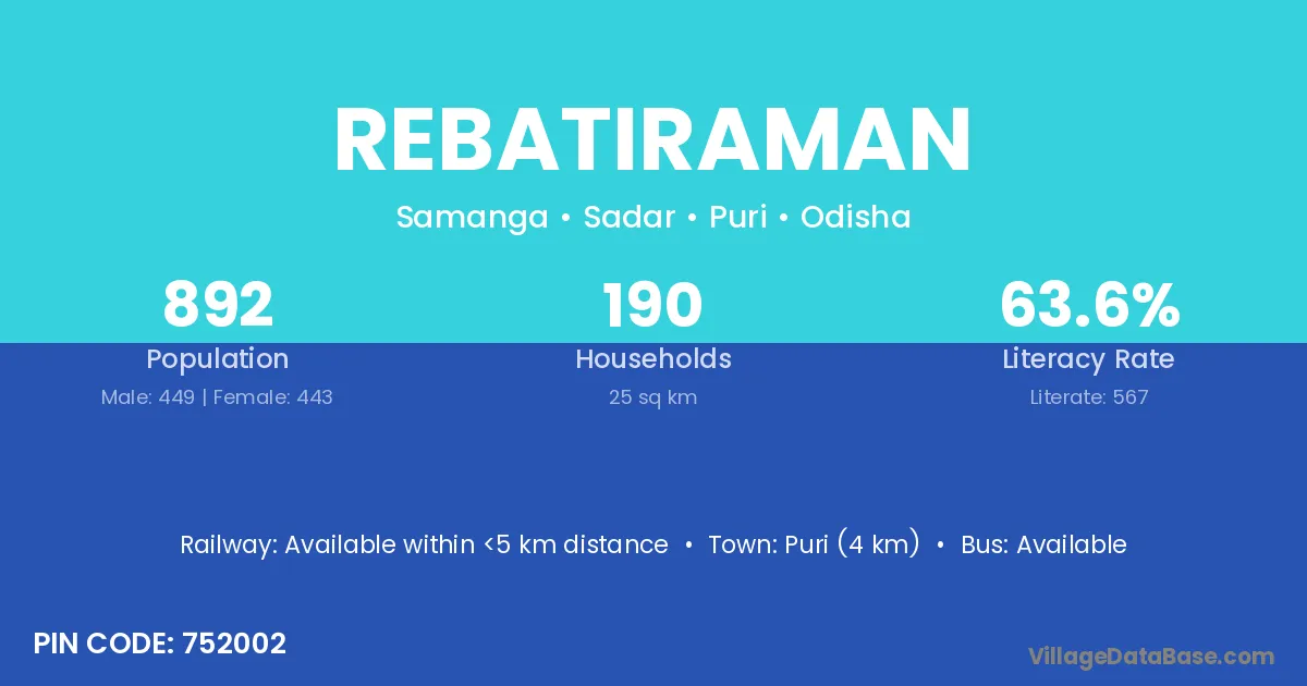 Puri (4 km) is the nearest town to Rebatiraman village for major economic activities and is located approximately 4 km away.