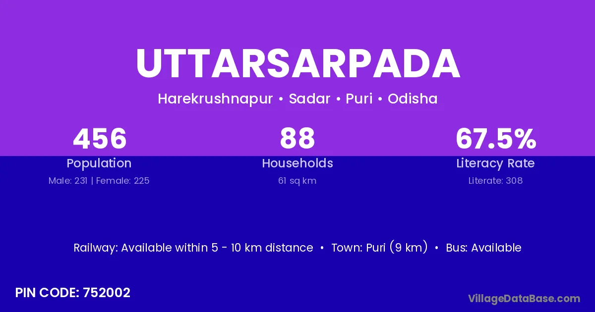 Puri (9 km) is the nearest town to Uttarsarpada village for major economic activities and is located approximately 9 km away.
