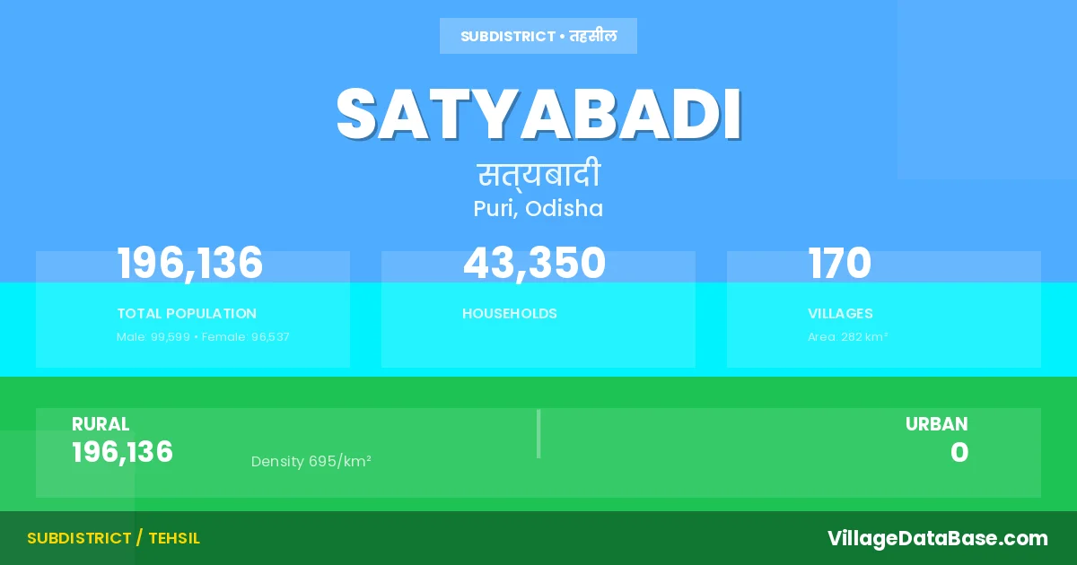 According to the 2011 census The total area of Satyabadi Tehsil is 282 km², with a population of 196136 people. The population density is 695 inhabitants per square kilometre, and there are approximately 43350 houses in the sub district.