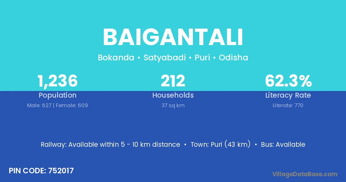 Puri (43 km) is the nearest town to Baigantali village for major economic activities and is located approximately 43 km away.