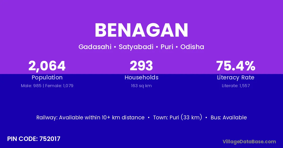 Puri (33 km) is the nearest town to Benagan village for major economic activities and is located approximately 33 km away.