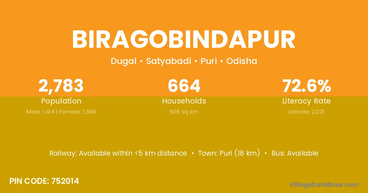 Puri (18 km) is the nearest town to Biragobindapur village for major economic activities and is located approximately 18 km away.