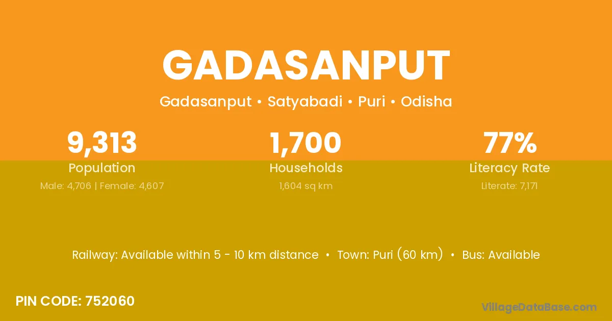 Puri (60 km) is the nearest town to Gadasanput village for major economic activities and is located approximately 60 km away.