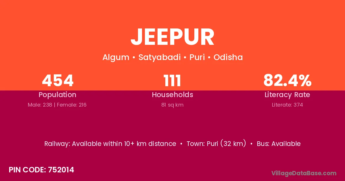 Puri (32 km) is the nearest town to Jeepur village for major economic activities and is located approximately 32 km away.