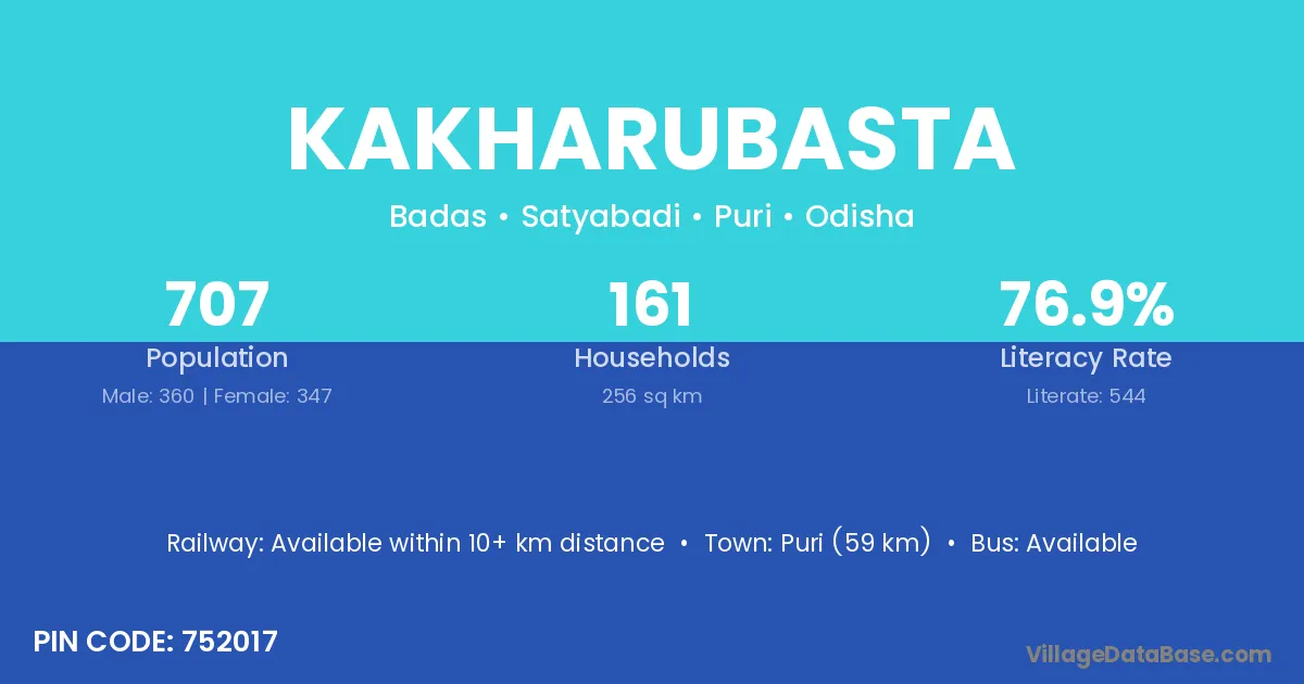 Puri (59 km) is the nearest town to Kakharubasta village for major economic activities and is located approximately 59 km away.