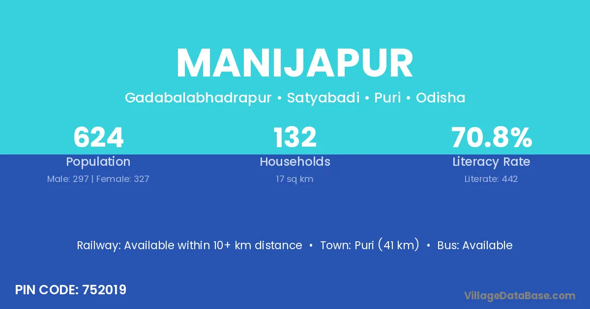 Puri (41 km) is the nearest town to Manijapur village for major economic activities and is located approximately 41 km away.