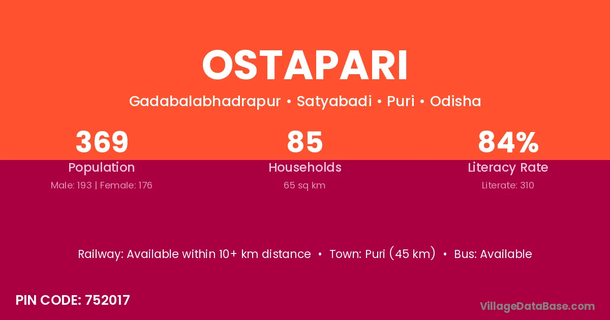 Puri (45 km) is the nearest town to Ostapari village for major economic activities and is located approximately 45 km away.