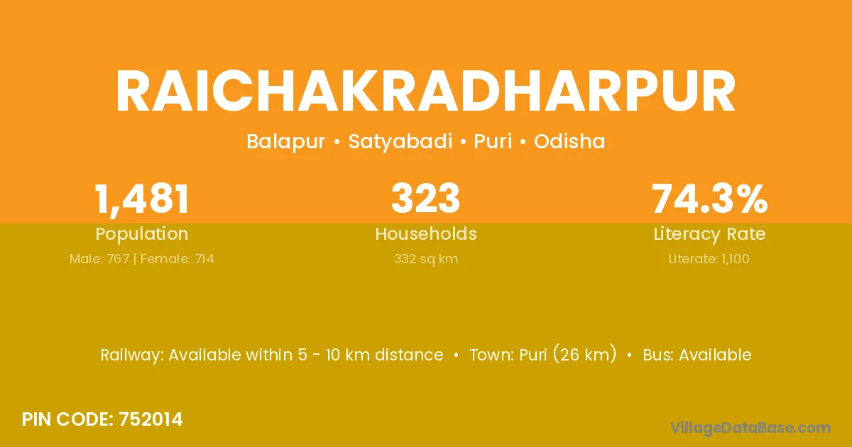 Puri (26 km) is the nearest town to Raichakradharpur village for major economic activities and is located approximately 26 km away.
