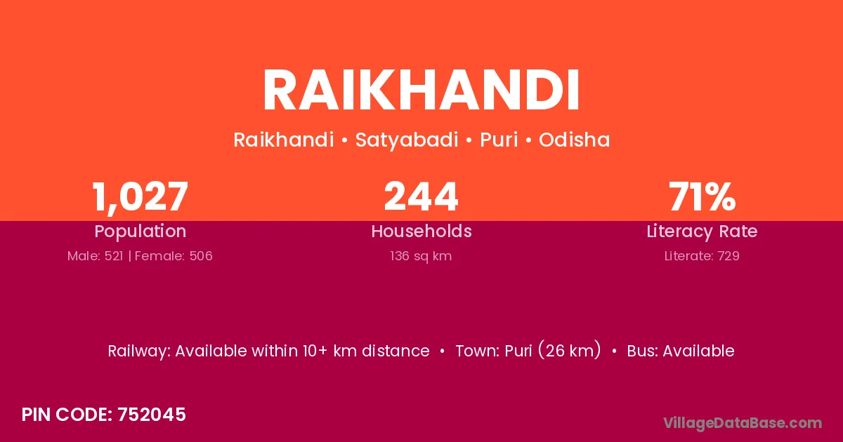 Puri (26 km) is the nearest town to Raikhandi village for major economic activities and is located approximately 26 km away.
