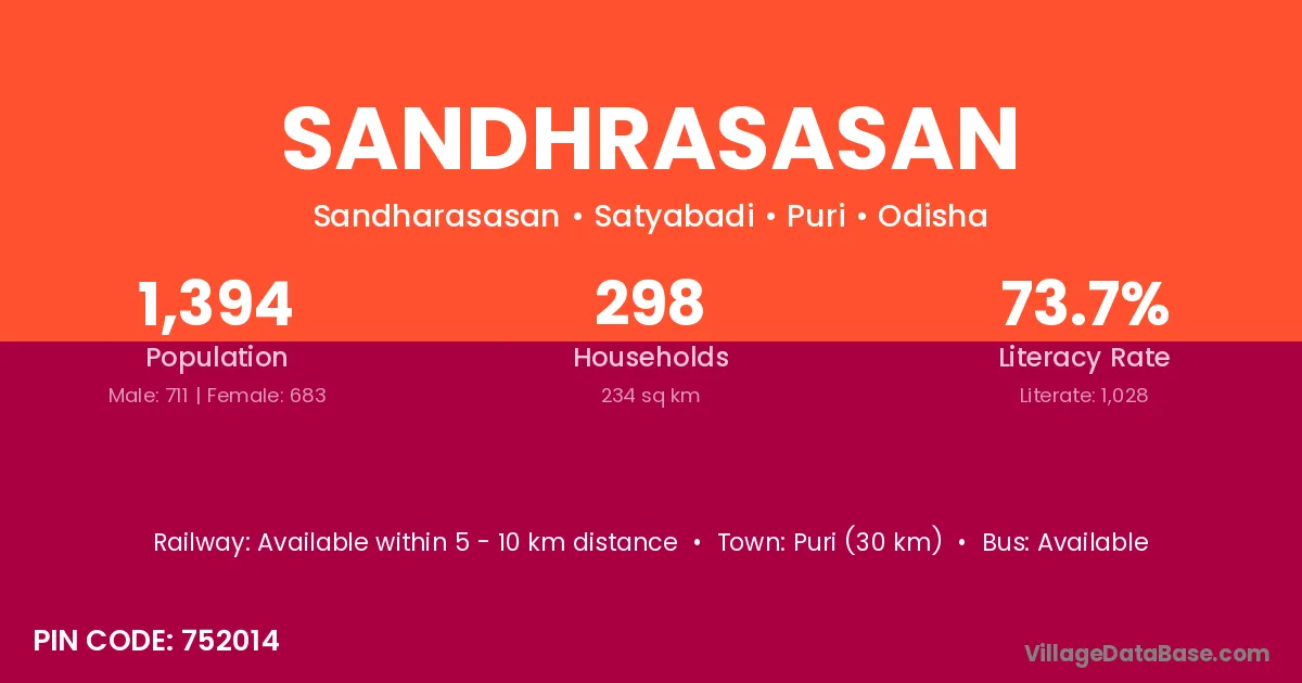 Puri (30 km) is the nearest town to Sandhrasasan village for major economic activities and is located approximately 30 km away.