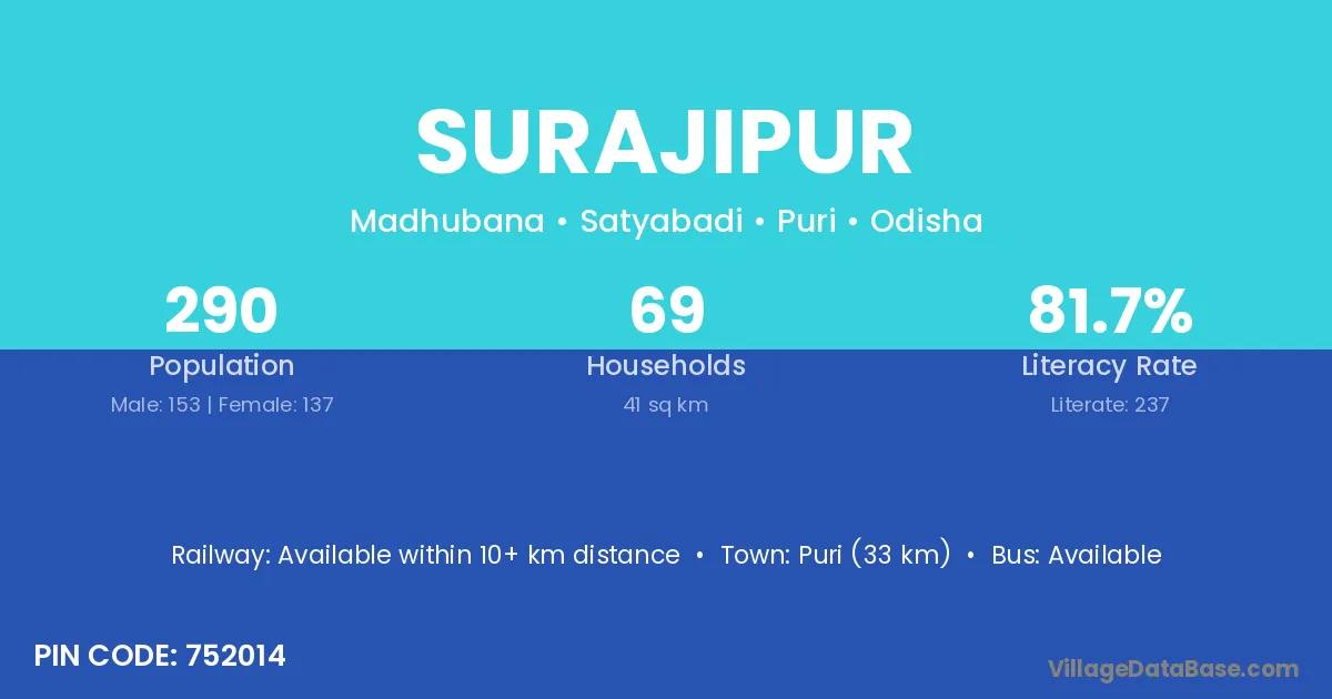 Puri (33 km) is the nearest town to Surajipur village for major economic activities and is located approximately 33 km away.