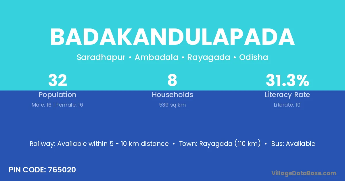 Rayagada (110 km) is the nearest town to Badakandulapada village for major economic activities and is located approximately 110 km away.