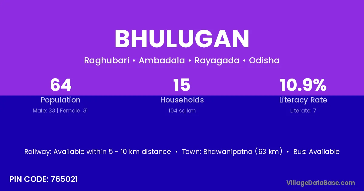 Bhawanipatna (63 km) is the nearest town to Bhulugan village for major economic activities and is located approximately 63 km away.