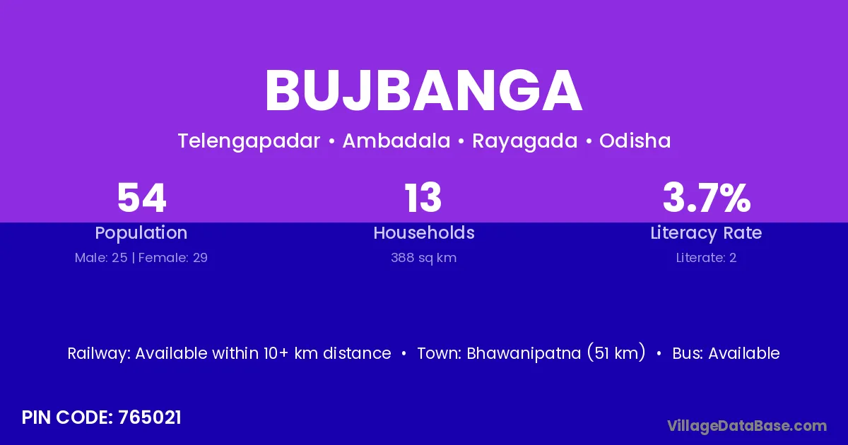 Bhawanipatna (51 km) is the nearest town to Bujbanga village for major economic activities and is located approximately 51 km away.