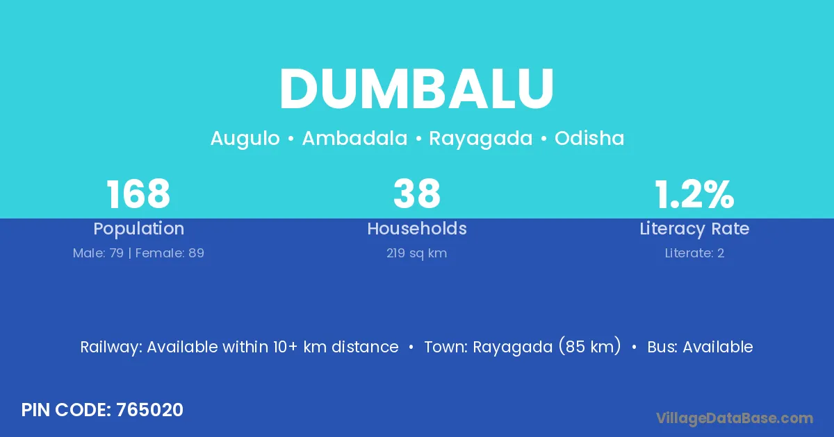 Rayagada (85 km) is the nearest town to Dumbalu village for major economic activities and is located approximately 85 km away.