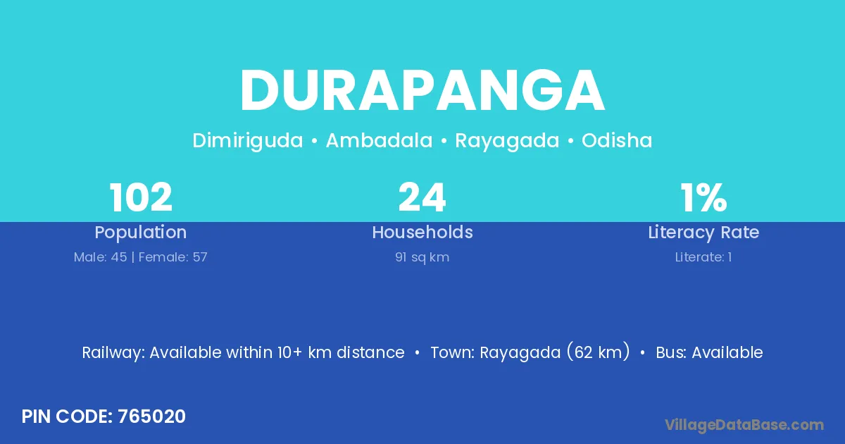 Rayagada (62 km) is the nearest town to Durapanga village for major economic activities and is located approximately 62 km away.