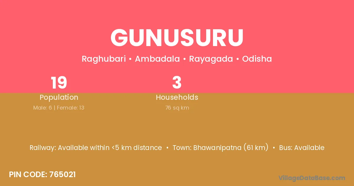Bhawanipatna (61 km) is the nearest town to Gunusuru village for major economic activities and is located approximately 61 km away.