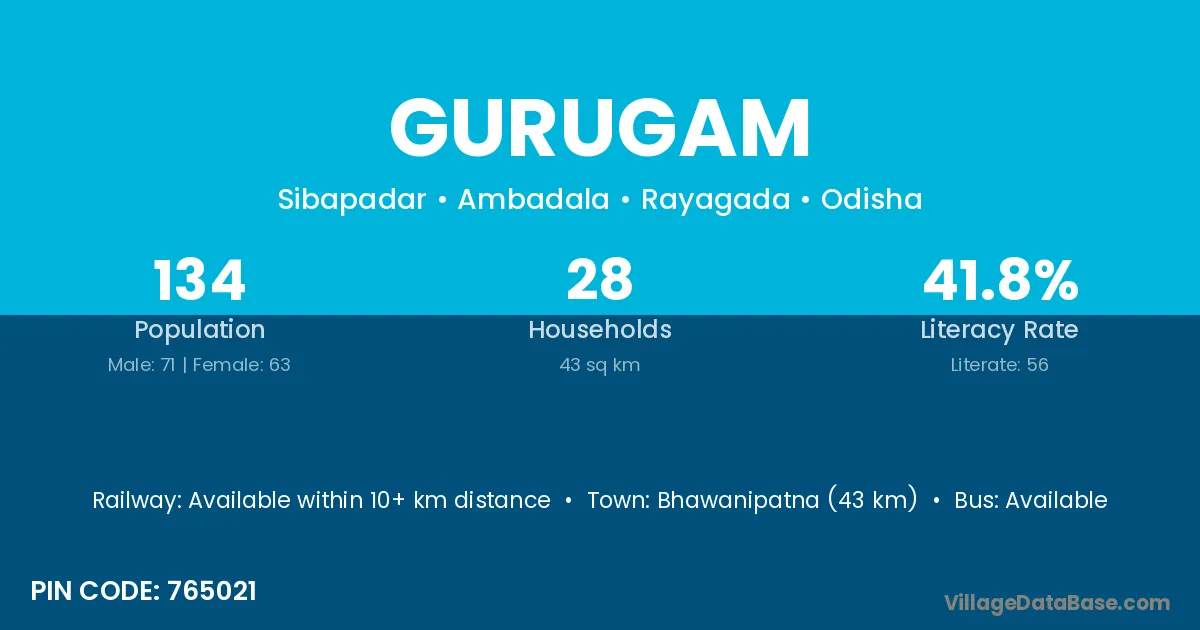 Bhawanipatna (43 km) is the nearest town to Gurugam village for major economic activities and is located approximately 43 km away.
