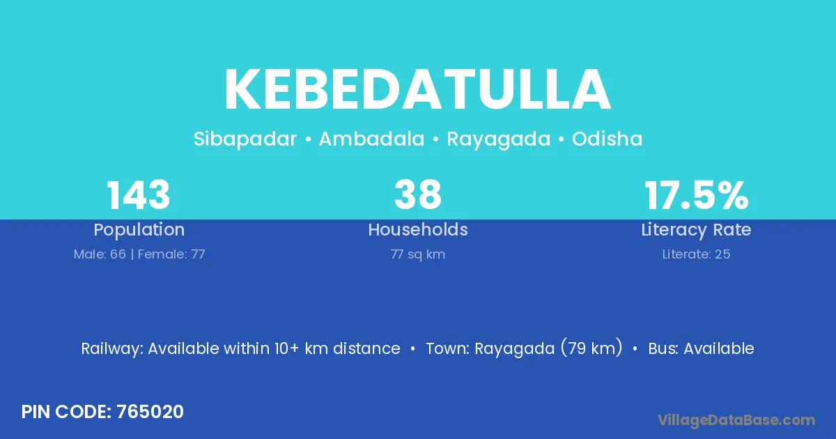 Rayagada (79 km) is the nearest town to Kebedatulla village for major economic activities and is located approximately 79 km away.