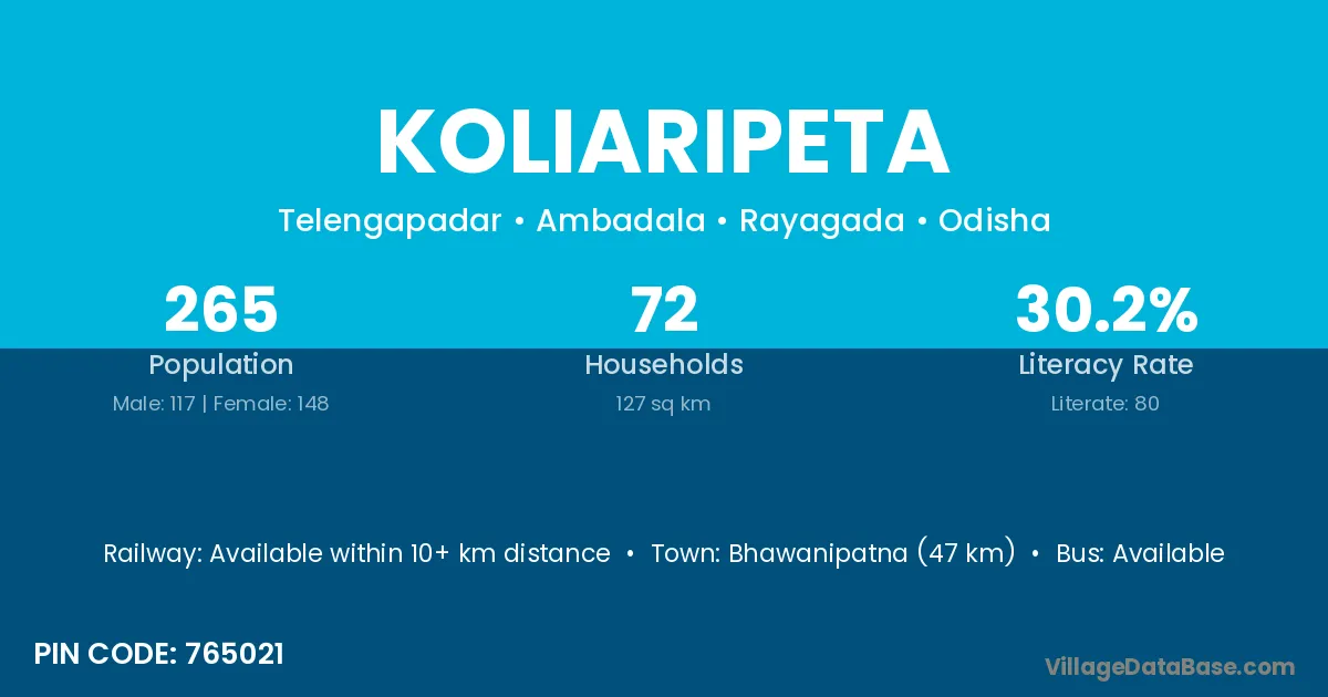 Bhawanipatna (47 km) is the nearest town to Koliaripeta village for major economic activities and is located approximately 47 km away.