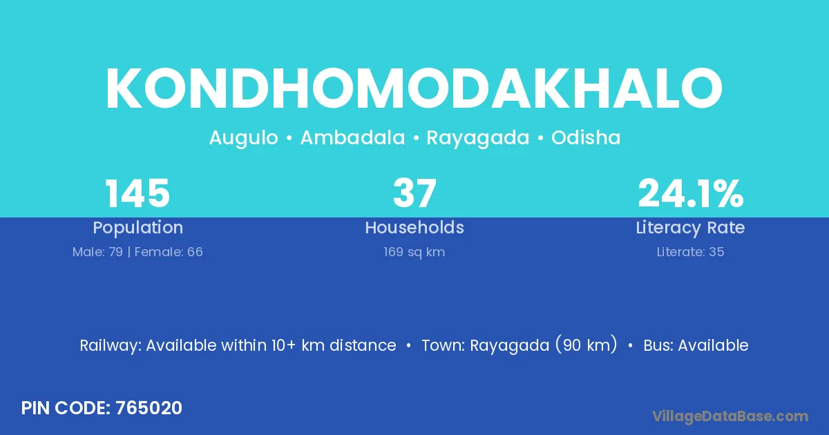 Kondhomodakhalo village has a total population of 145 people, of which 79 are males and 66 are females.