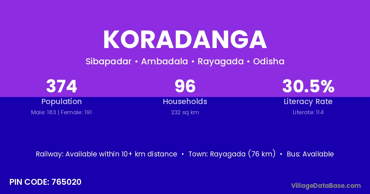 Rayagada (76 km) is the nearest town to Koradanga village for major economic activities and is located approximately 76 km away.