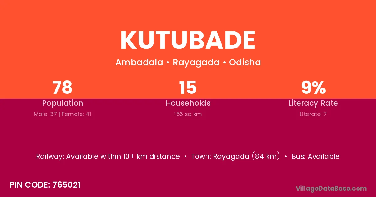 Rayagada (84 km) is the nearest town to Kutubade village for major economic activities and is located approximately 84 km away.