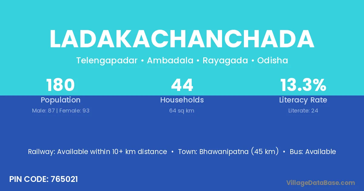 Bhawanipatna (45 km) is the nearest town to Ladakachanchada village for major economic activities and is located approximately 45 km away.