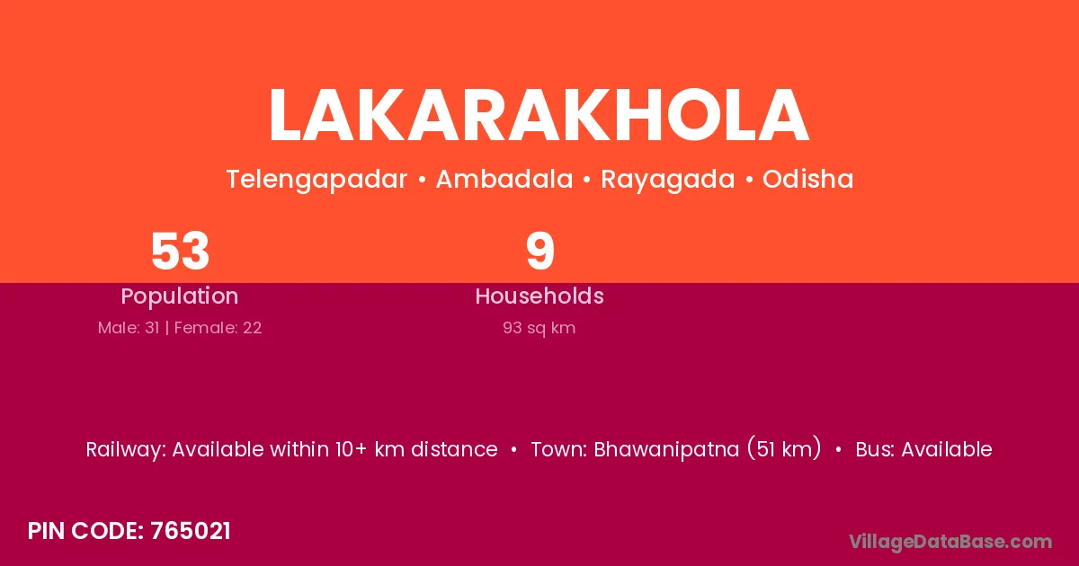 Bhawanipatna (51 km) is the nearest town to Lakarakhola village for major economic activities and is located approximately 51 km away.