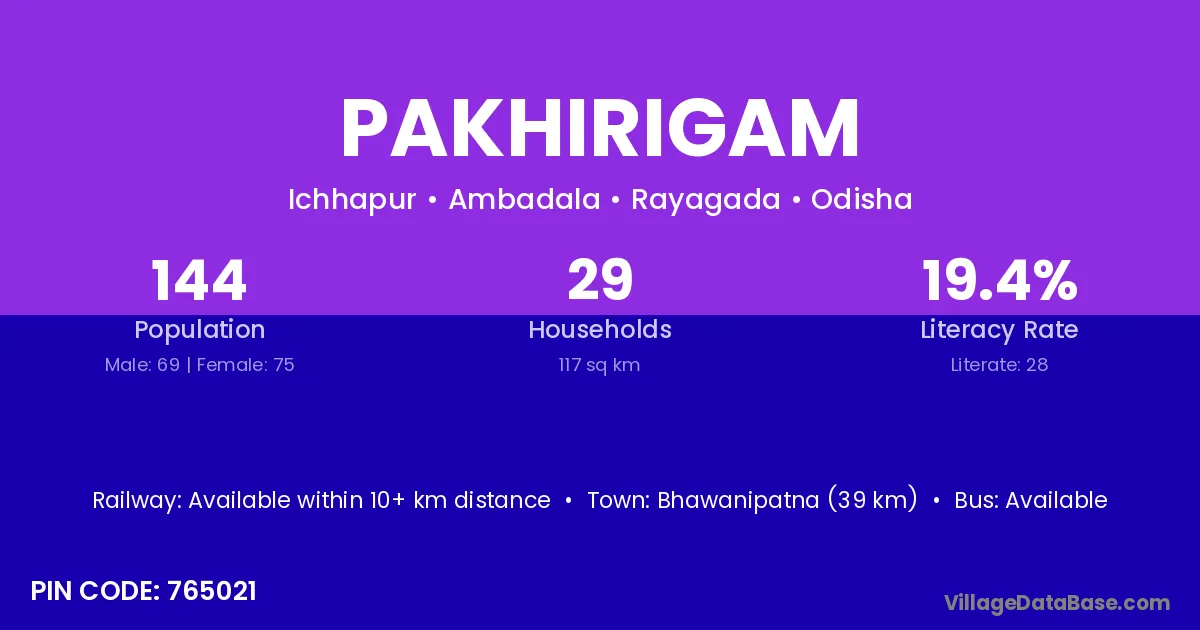 Bhawanipatna (39 km) is the nearest town to Pakhirigam village for major economic activities and is located approximately 39 km away.