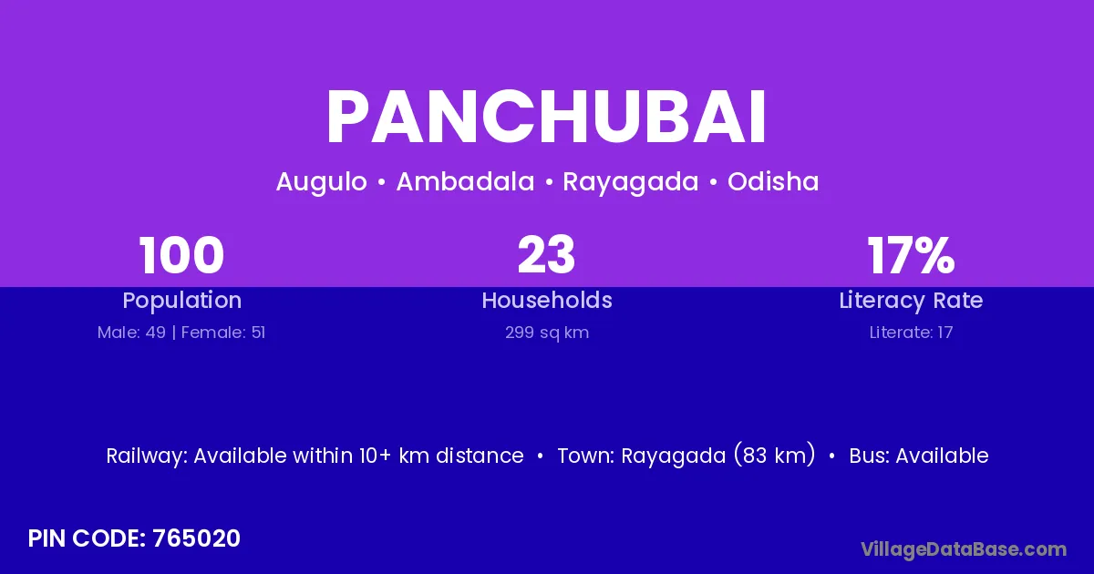 Rayagada (83 km) is the nearest town to Panchubai village for major economic activities and is located approximately 83 km away.