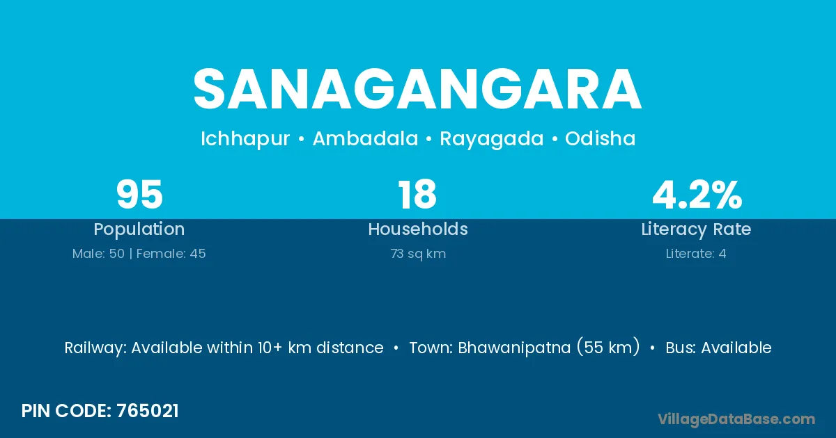 Bhawanipatna (55 km) is the nearest town to Sanagangara village for major economic activities and is located approximately 55 km away.