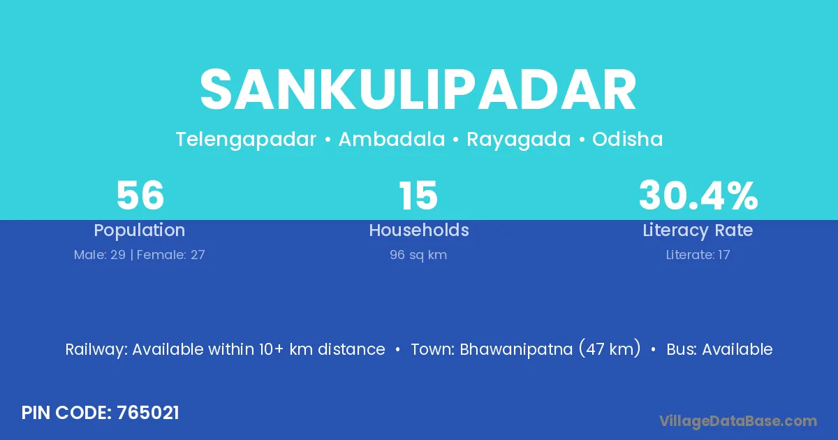 Bhawanipatna (47 km) is the nearest town to Sankulipadar village for major economic activities and is located approximately 47 km away.