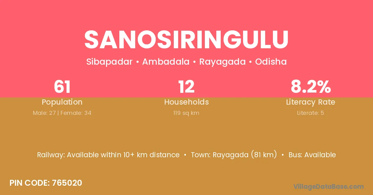 Rayagada (81 km) is the nearest town to Sanosiringulu village for major economic activities and is located approximately 81 km away.