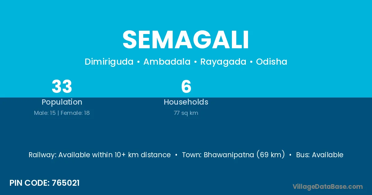 Bhawanipatna (69 km) is the nearest town to Semagali village for major economic activities and is located approximately 69 km away.