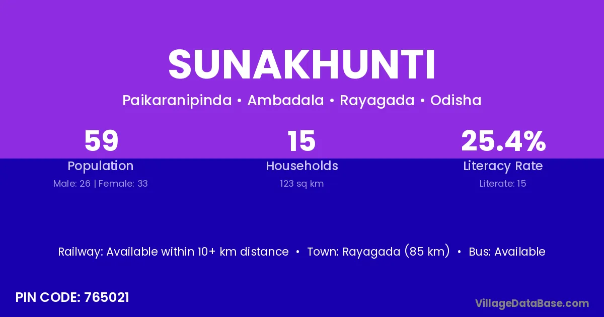 Rayagada (85 km) is the nearest town to Sunakhunti village for major economic activities and is located approximately 85 km away.