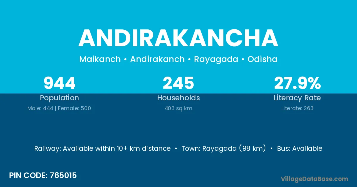 Rayagada (98 km) is the nearest town to Andirakancha village for major economic activities and is located approximately 98 km away.