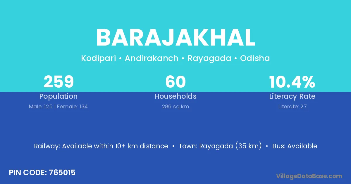 Rayagada (35 km) is the nearest town to Barajakhal village for major economic activities and is located approximately 35 km away.