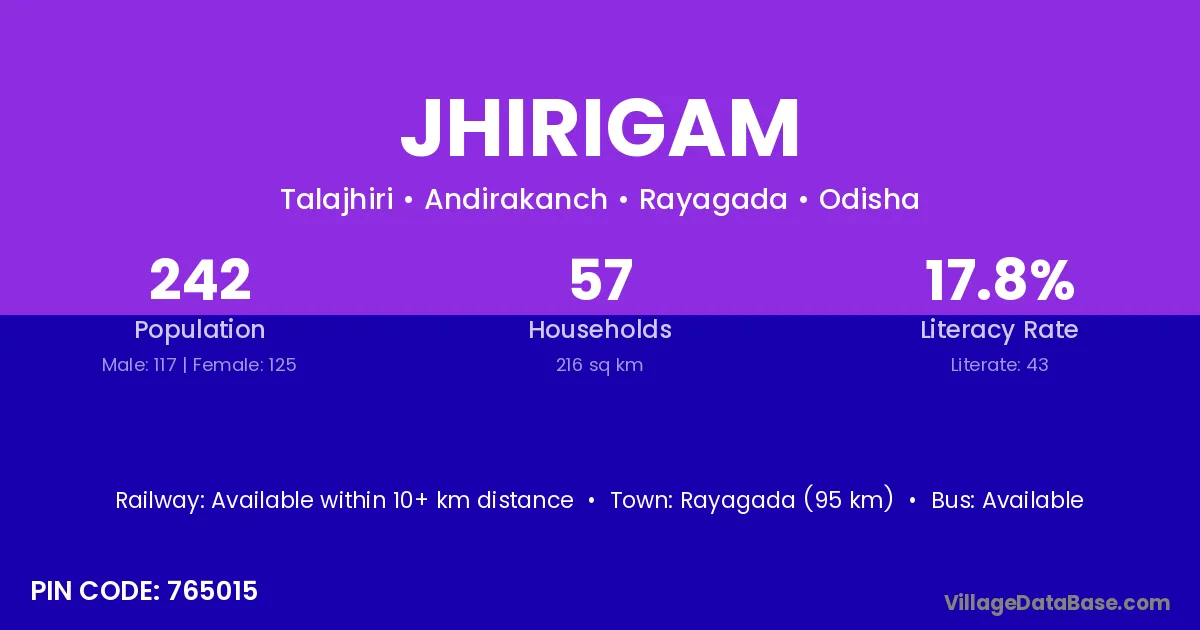 Rayagada (95 km) is the nearest town to Jhirigam village for major economic activities and is located approximately 95 km away.