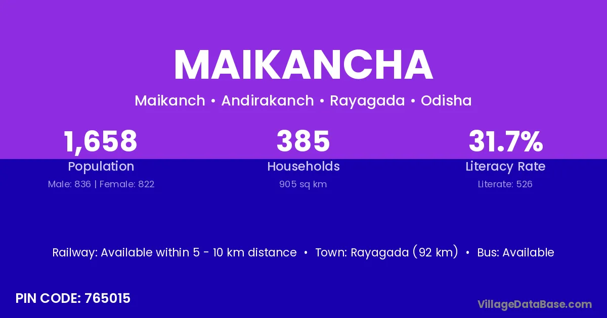 Rayagada (92 km) is the nearest town to Maikancha village for major economic activities and is located approximately 92 km away.