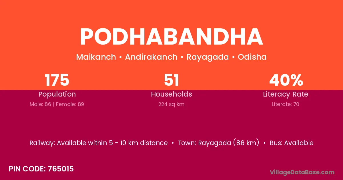 Rayagada (86 km) is the nearest town to Podhabandha village for major economic activities and is located approximately 86 km away.