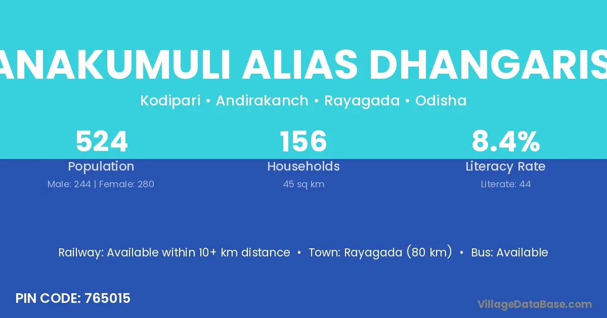Rayagada (80 km) is the nearest town to Sanakumuli Alias Dhangarisil village for major economic activities and is located approximately 80 km away.