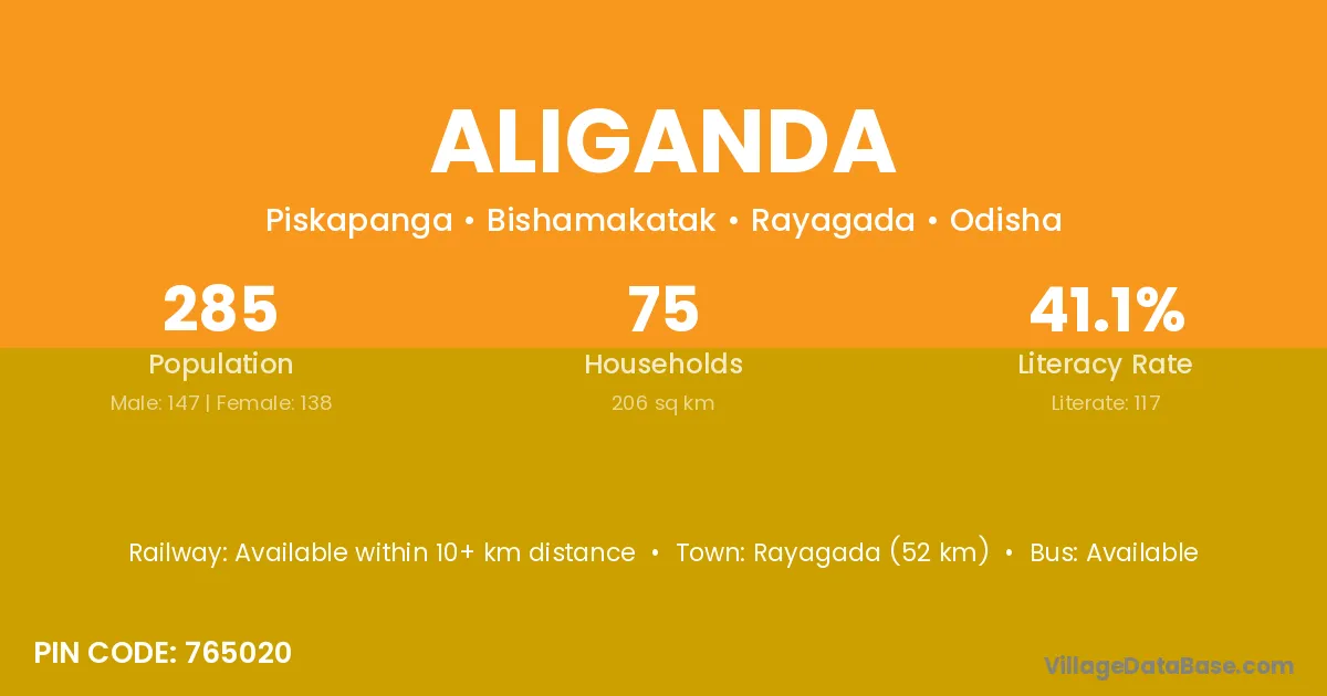 Rayagada (52 km) is the nearest town to Aliganda village for major economic activities and is located approximately 52 km away.