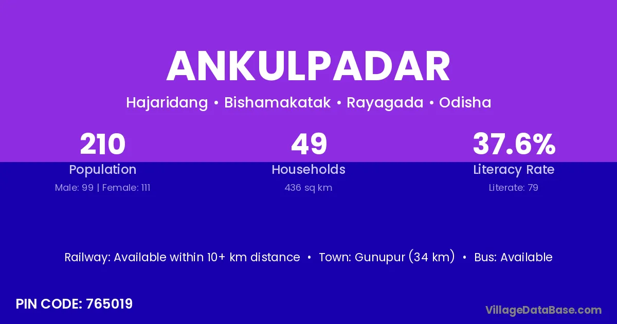 Gunupur (34 km) is the nearest town to Ankulpadar village for major economic activities and is located approximately 34 km away.