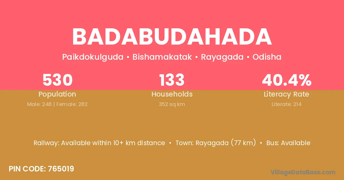 Rayagada (77 km) is the nearest town to Badabudahada village for major economic activities and is located approximately 77 km away.