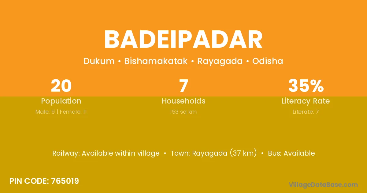 Rayagada (37 km) is the nearest town to Badeipadar village for major economic activities and is located approximately 37 km away.