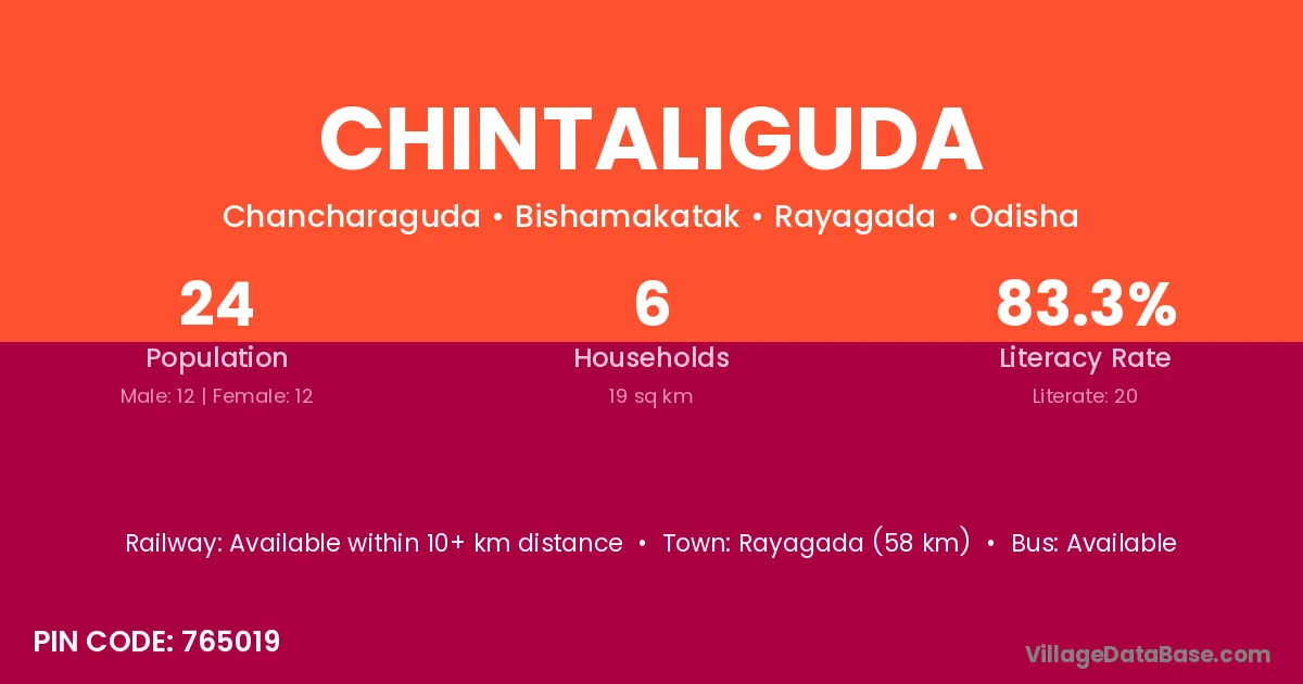 Rayagada (58 km) is the nearest town to Chintaliguda village for major economic activities and is located approximately 58 km away.